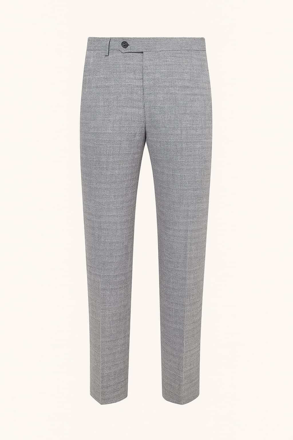 Redefine your formal wardrobe with these light grey textured trousers, designed for a sleek and sophisticated look. Crafted with premium fabric featuring a subtle crosshatch weave, these trousers provide both comfort and elegance. The slim fit cut, flat-front styling, and sharp crease lines make them a versatile choice for business meetings, formal occasions, or smart-casual gatherings.