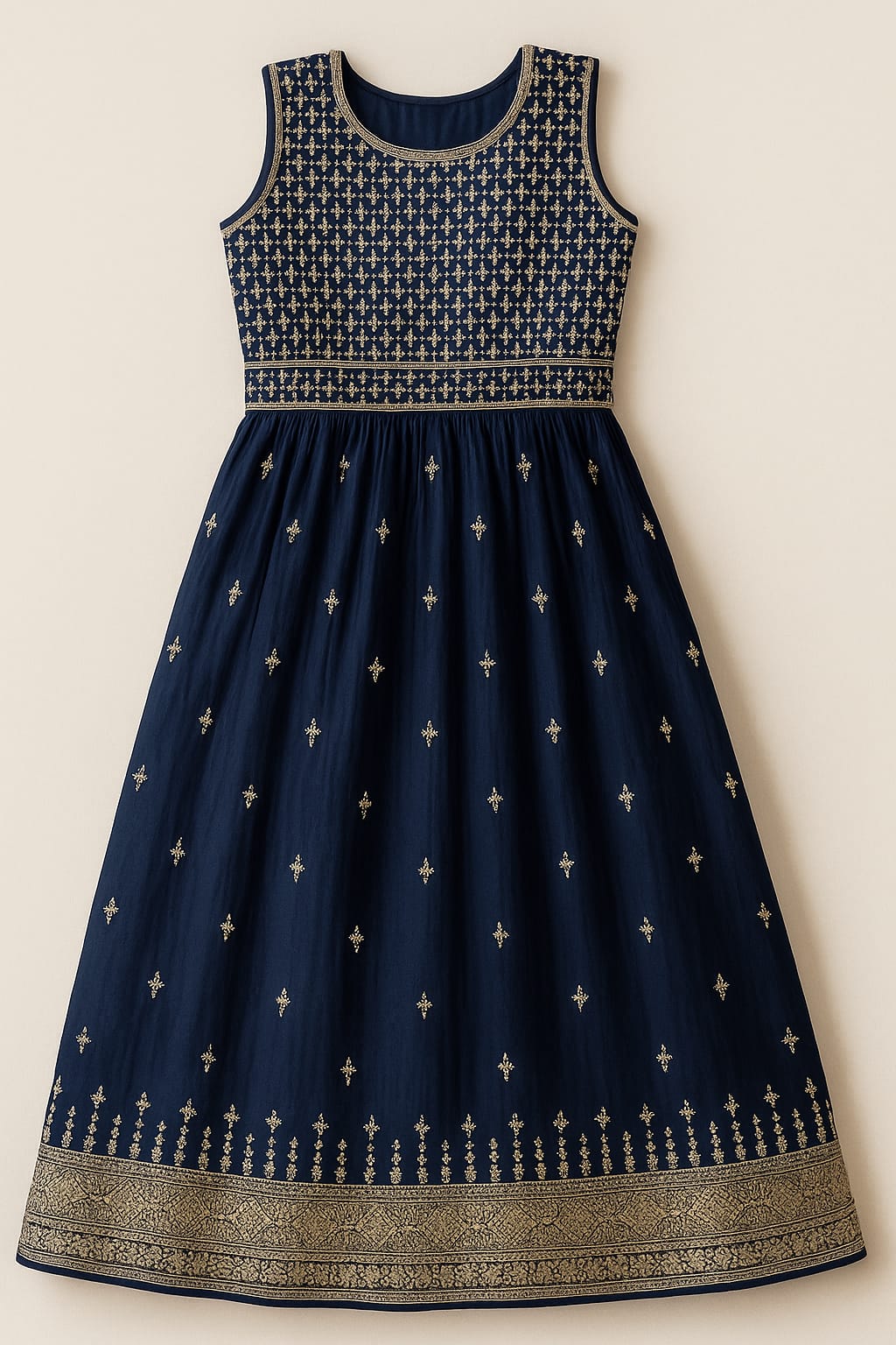 Elevate your little one’s festive style with this lehenga. Crafted with fine detailing, the sleeveless design features delicate golden embroidery on the bodice and intricate motifs throughout the flare. The hemline is beautifully finished with an ornate embroidered border, adding a regal touch to the outfit. Perfect for weddings, festivals, and traditional celebrations, this lehenga blends elegance with comfort for all-day wear.